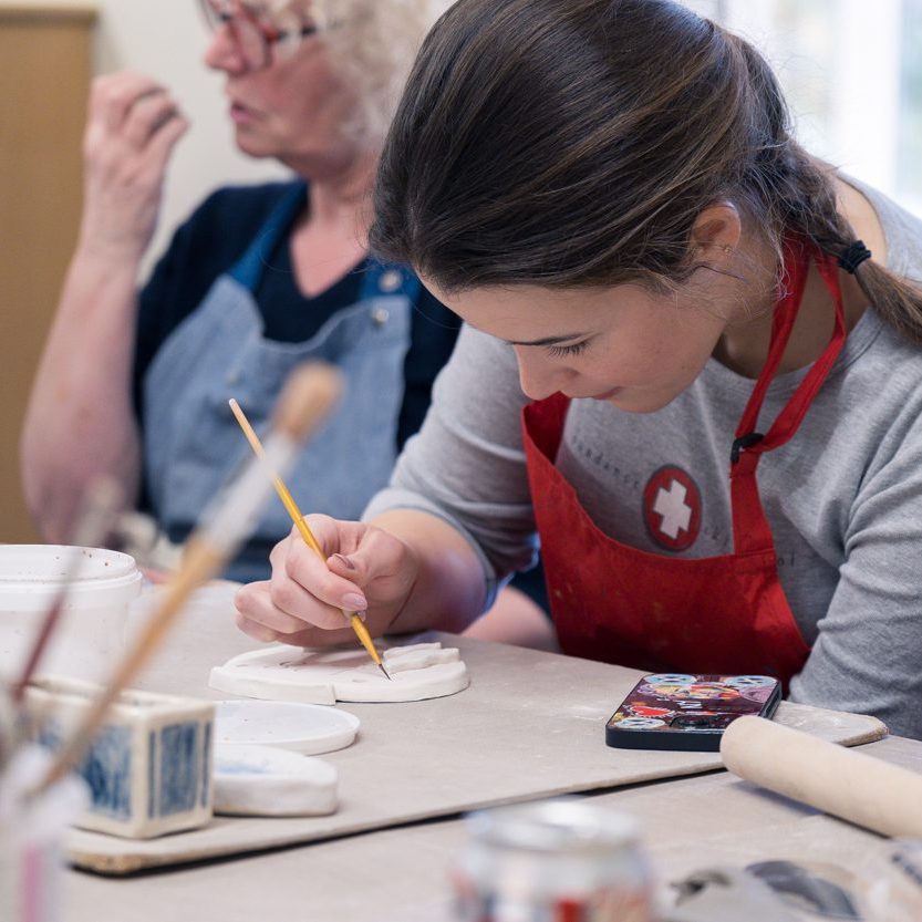 We cover a range of hand-building, wheel throwing, and glazing techniques and work is fired regularly at the Centre. We have six pottery wheels of varying sizes, including one for people with low-mobility that does not require the use of a foot peddle. The wheels are in our bright ‘pottery kitchen’ where you will also find a glazing station. There is a drying room, kiln house with multiple kilns, and a pottery studio where you can sit or stand to work.